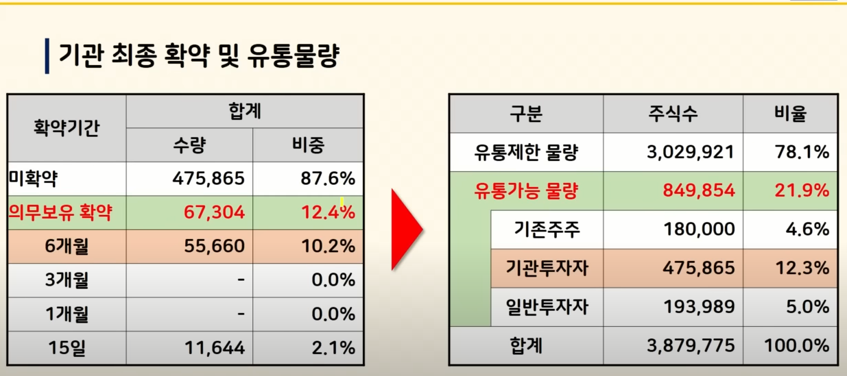 그래서 유통 물량은 약 85만 건 비율로 21.9%까지 줄었고요 그중 기관이 12.3%로 가장 많은데 전반적으로 물량 자체는 많지 않은 것 같습니다. 그래서 최종 유통 금액은 12억 줄어서 153억으로 확정이 됐고요 200억이 한참 안 되는 상황이라서 상장을 수급만 받쳐준다면 의외로 좋은 결과 기대할 수도 있을 것 같습니다.