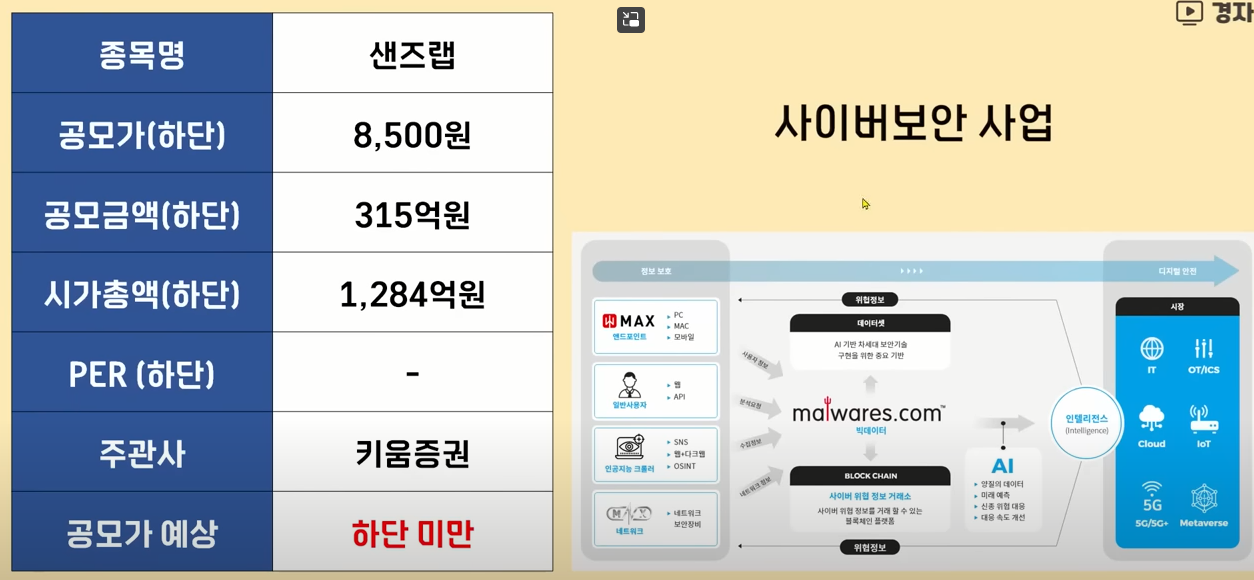 작년에 상장을 처리했었던 SK 쉴더스와 사업 영역이 비슷한 것으로 보이고요 하단 공모 가격은 8,500원인데 미래 실적으로 공모가를 선정을 했습니다. 그래서 공모 가격은 아마도 하단 미만으로 정해질 것 같습니다. 그리고 청약 주관사는 키움증권이 담당을 합니다.