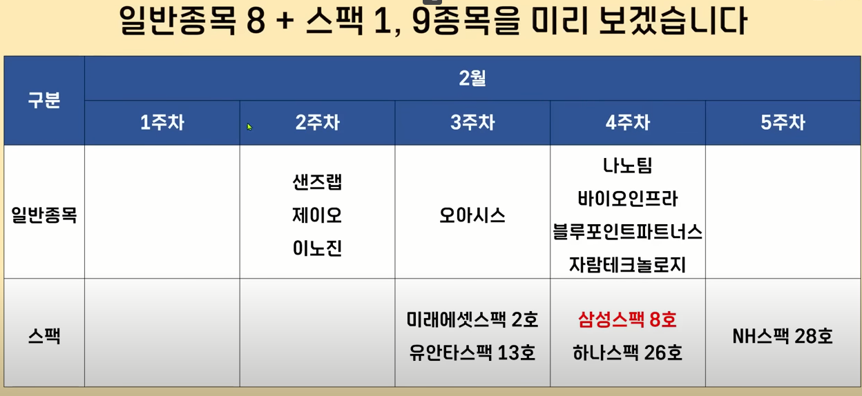 2주 차의 세 종목 3주 차의 한 종목 4주 차의 4 종목 그래서 총 일반 종목은 8 종목이 되고요 그리고 스팩이 5 종목 등장하는데 다른 증권사 스팩은 보지 않고요 스팩 대장님인 삼성 스팩 8호가 4주 차에 등장을 합니다. 삼성 스팩 항상 우리를 실망시키지 않았습니다.