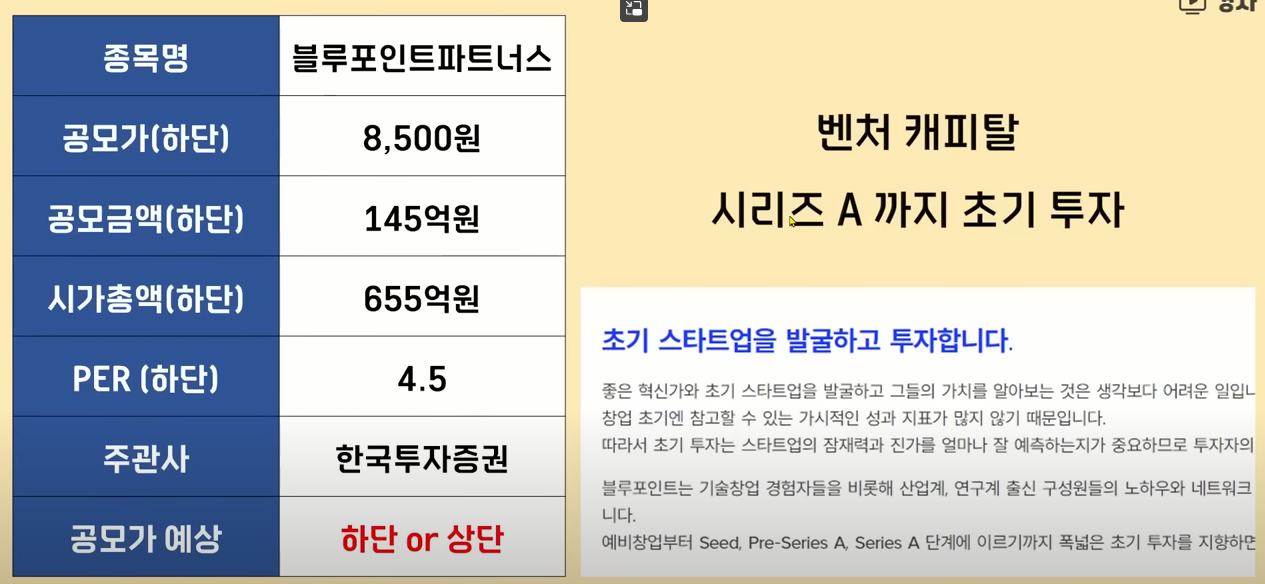 이 회사는 시리즈 a까지 초기 투자를 주로 담당하고 있고 이익은 꾸준하게 나오고 있습니다. 그래서 공모 가격 하단 기준으로 per이 4.5배 던데요 공모가 밴드가 무리하게 책정된 것은 아니라고 보이기 때문에 공모 가격은 하단 아니면 상단으로 잡힐 것 같습니다.