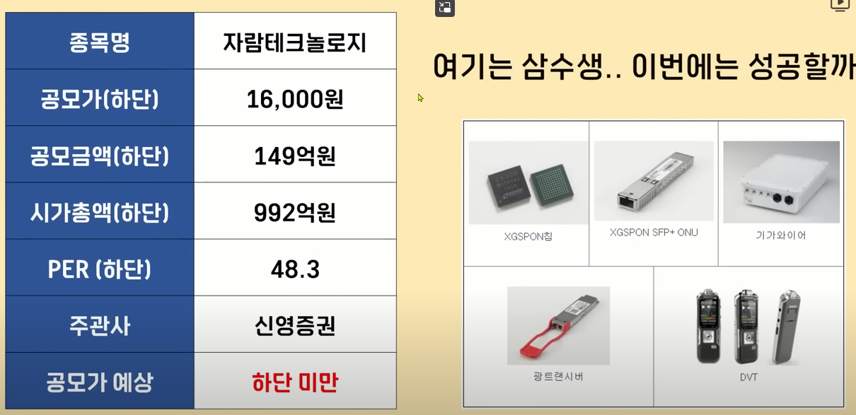 여하튼 종목은 수요 예측 결과가 아주 좋게 나온다면 청약을 하고 아니면 패스를 하려고 합니다. 2월 마지막 종목은 자람테크놀로지입니다. 많이 들어보셨죠 그렇습니다 삼수생입니다. 작년 11월에 수요예측도 하지 않고 그냥 철회를 하더니 12월에 또 등장해서 이번에는 수요예측을 했었거든요 그리고는 또 철회를 했습니다.