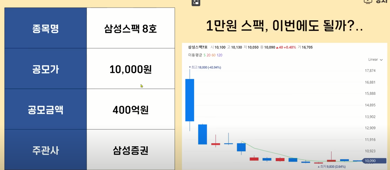 세 번째 종목은 스팩 대장님인 삼성스팩 입니다 삼성증권의 8번째 스팩이구요 이번에도 공모가는 만원으로 등장을 합니다 공모 가격이 만원이었던 7호 스팩도 상장이라는 괜찮은 수익을 주었는데 최근 주가를 보니까 거의 공모 가격 근처까지 주가가 내려왔습니다. 그래서 같은 조건으로 등장하는 8호가 여전히 괜찮은 수익을 줄지는 약간 애매해졌다 이렇게 보고 있습니다. 공모금액은 400억 원으로 사이즈가 큰 스펙이고요 주관사는 삼성증권입니다.