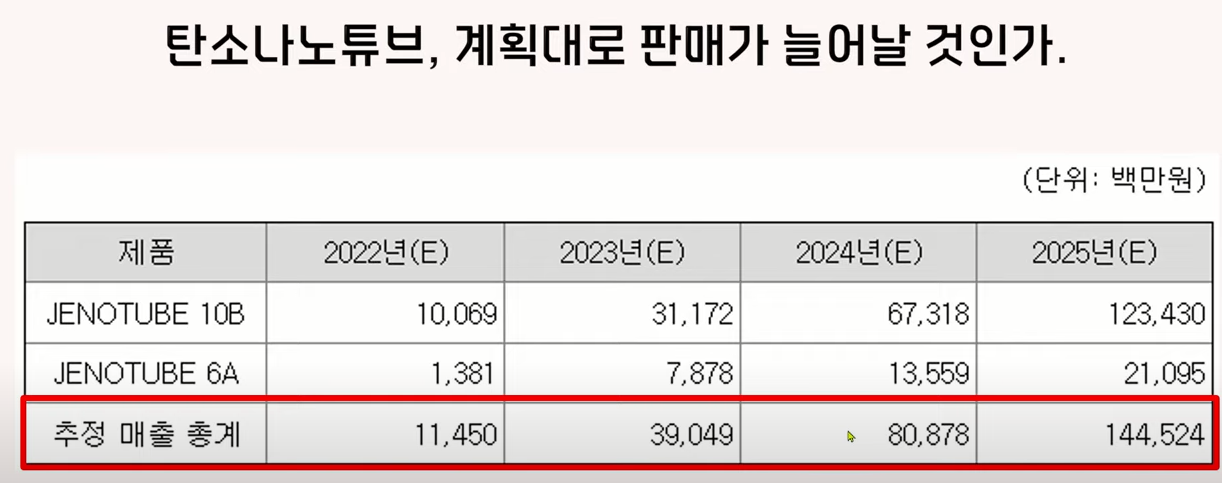 매년 매출 볼륨이 성큼성큼 늘어나고 있으면서 성장하고 있다는 이런 느낌을 주는 것도 아니니까요 그래도 회사의 미래인 탄소나노튜브는 조금씩 매출이 늘어나고 있는데요 회사는 올해 탄소나노팁은 매출이 22년 대비 4배가 늘어나고 24년에는 22년 대비 8배가 늘어날 것으로 전망을 합니다.