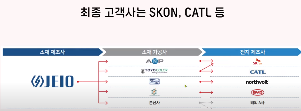 제이호는 이 소재를 가공하는 회사에게 공급을 하면이 가공사에서 2차 전지를 만드는 셀메이커들에게 최종 납품하는 구조인가 본데요 그래서 최종 고객사는 국내에서는 skon이고 해외에서는 catl이나 노스볼트라고 합니다.