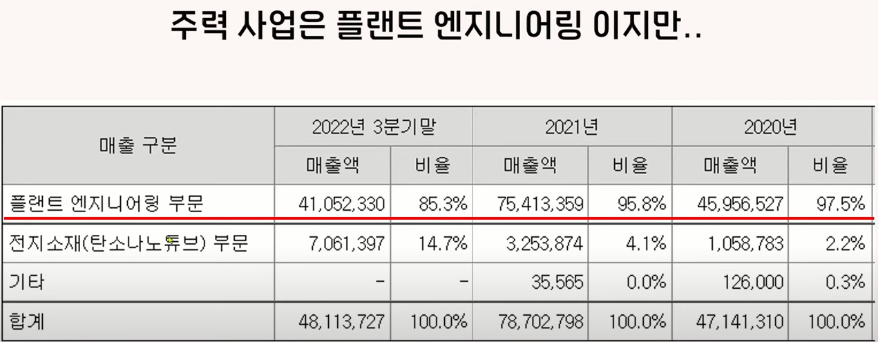 회사를 파악해 보겠습니다 화면 제이오는 주력 사업이 플랜트 엔지니어링입니다 22년에도 플랜트에서 매출 비중이 85%가 나오고 있으니까요 주력 사업이라고 볼 수가 있죠. 하지만이 종목은 향후 전지 소재를 주력으로 키우려고 합니다 그래서 오늘은 회사의 미래가 될 전지 소재만 말씀을 드리겠습니다.