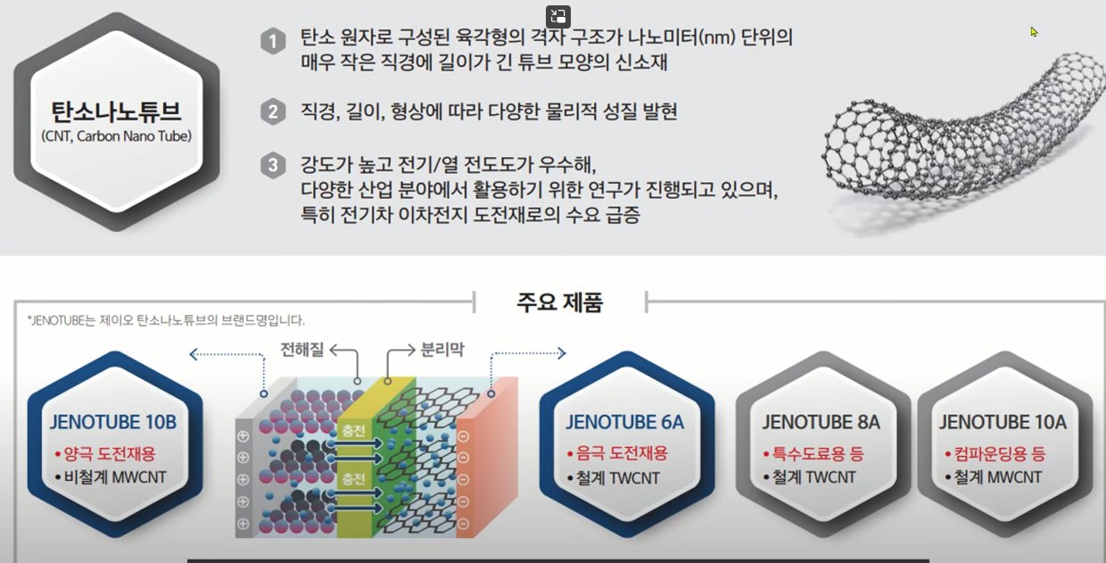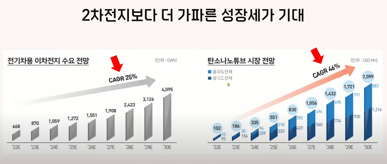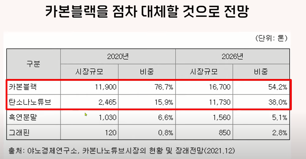 그래서 지금은 도전제로 카본 블랙을 70% 이상 사용하고 있는데 점차 탄소나노튜브가 대체를 하면서 2026년이 되면 카본 블랙 비중은 54%로 내려오고 탄소나노튜브는 38%까지 점유율이 올라간다고 전망하고 있습니다.