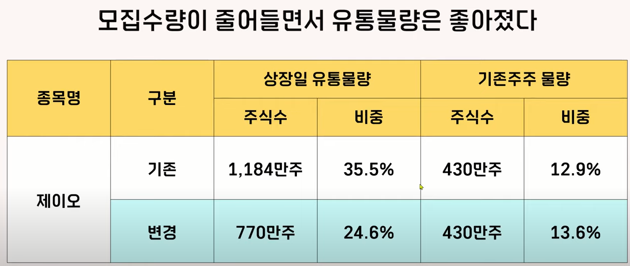 그리고 제이오는 상장을 유통물량도 좋아졌는데요 기존 주주 물량은 430만 주로 동일한데 공으로 모집하는 수량이 확 줄었잖아요 그래서 기존에는 상장일 유통물량 비중이 35.5%였는데 이제는 24.6%로 내려왔습니다. 다시 등장하려고 조건을 많이 개선을 시켰는데 청약까지 이어질 수 있을지 궁금합니다.