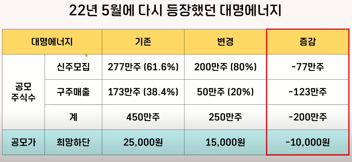 참고로 작년에 제이오처럼 상장을 철회했다가 다시 등장한 종목이 하나 있었는데요 대명 에너지였습니다. 화면 보시면 대명 에너지도 모집 수량은 200만 주 줄였었고 공모 가격은 만원을 내려서 등장을 했습니다.