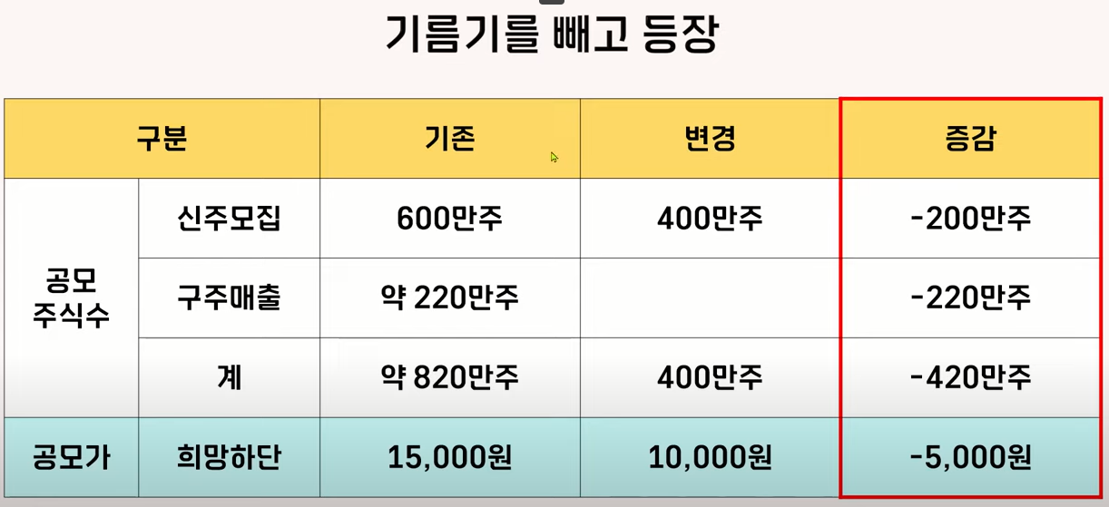 지난번보다 모집 수량을 절반 이상 줄였고요 그리고 저번에는 하단 공모가가 15,000원이었는데 이번에는 만원으로 변경을 했거든요 그래서 공모 가격도 5천 원이 낮아졌습니다.