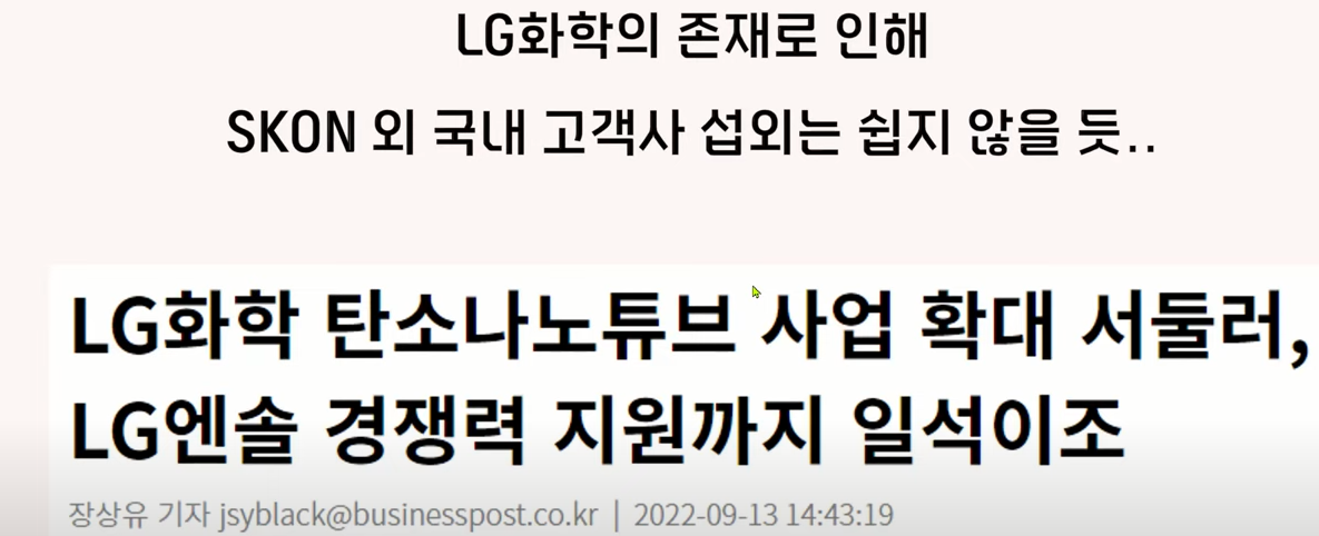 lg화학이 만드니까 당연히 LG 에너지설루션에게 공급이 되겠죠 그래서 제이오가 만드는 탄소나노튜브는 LG 엔솔에게 공급되는 것은 불가능할 것이고 삼성 sdi는 모르겠지만 여하튼 국내에서는 skon 이외에 고객사를 확대하는 게 쉽지는 않을 것으로 보입니다.