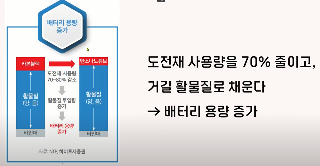 배터리 용량이 어떻게 증가되는지 조금 더 구체적으로 말씀을 드리면 지금은 카본 블랙을 100을 섞어 효율이 나온다면 탄소나노튜브는 30만 섞어도 비슷한 효율이 나온다고 합니다. 그럼 30만 섞었으니까 나머지 70을 양극재나 음극재 소재인 활물질로 채울 수가 있잖아요 이런 원리로 배터리 용량이 커지게 되는 것입니다.