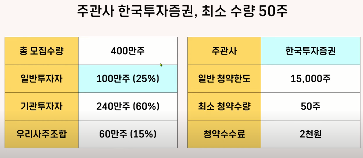 그리고 청약 최소 수량이 50주인데 요즘에 한투 보통 20주를 최소 청약수량으로 있었거든요 왱이 종목은 50주가 되었는지 모르겠습니다.