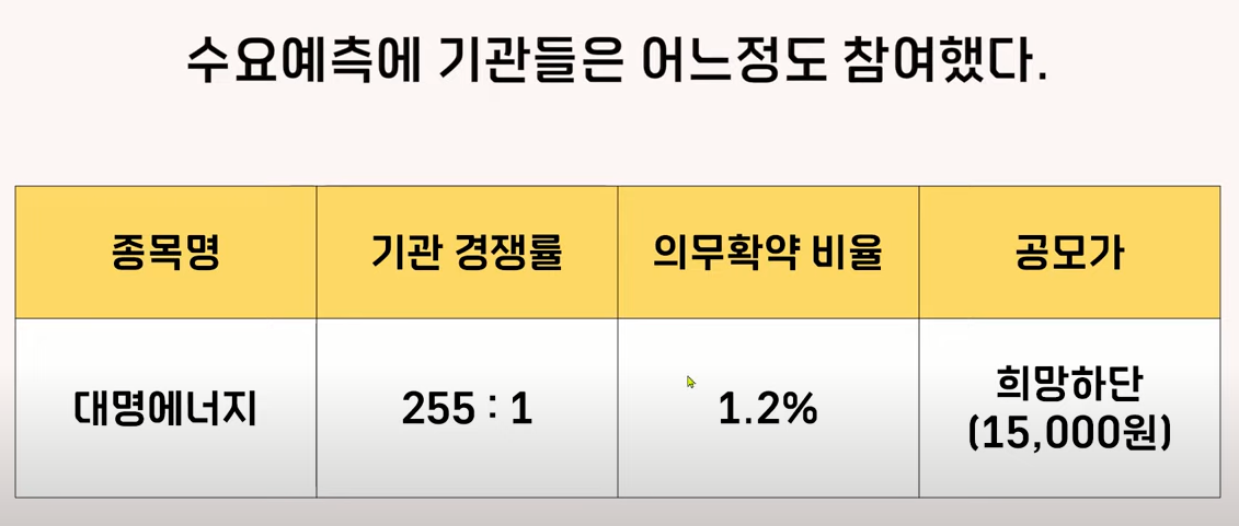 이런 변경된 조건에 기관들이 어느 정도는 호응을 해주었는데요 기관 경쟁률이 255대 1이 나왔고 의무확약 비율은 1.2%의 신청이 들어왔었습니다 그래서 공모가는 하단으로 정해졌었는데요 제이오 수요 예측이 흥행하기는 어렵겠지만 그래도 청약을 할 수준의 수요 예측은 나오지 않을까 생각을 해봅니다.