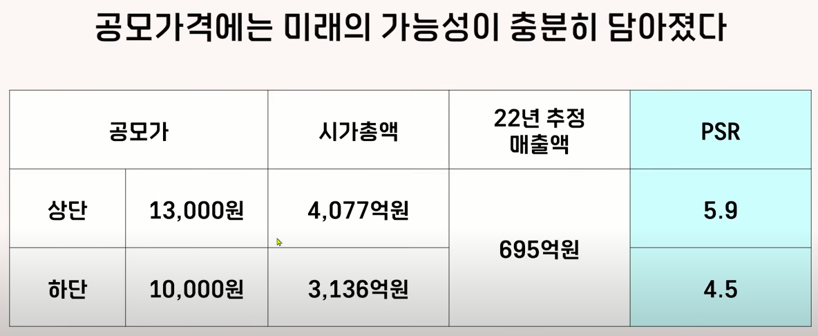 사실 공모주 투자를 하면서 IPO 하는 회사의 미래 계획이 달성된 사례를 거의 보지 못했습니다. 그래서 요즘에는 이런 장밋빛 전망을 보고 있으면 그냥 그러려니 하고 있는데요 여하튼 상단공모 가격이 13,000원 기준으로 시가총액은 약 4000억 원이 되고요 22년 추적 매출의 기준으로 psr은 5.9배입니다.