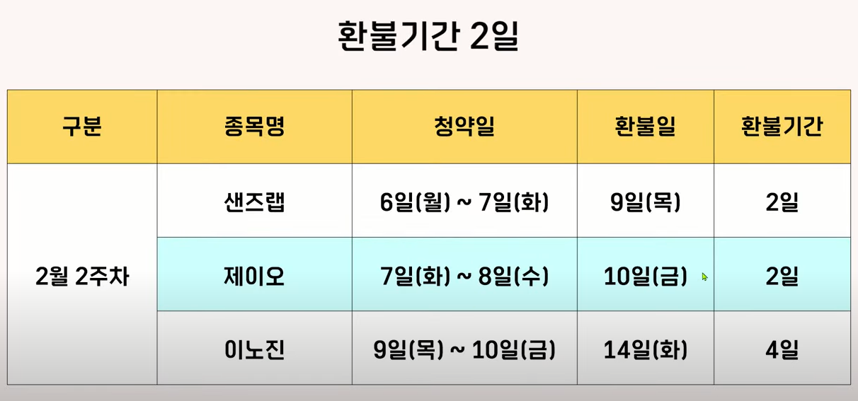 제이오는 다음 주 화요일과 수요일에 청약을 하고요 금요일에 환불됩니다. 환불 기간은 이틀인 청약이고요 같은 주에 청약하는 샌즈랩 이노진과는 청약 일정이 겹쳐 있습니다.