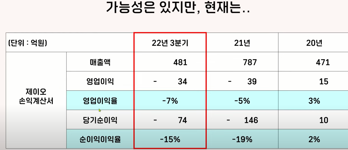 그래서 해외 수출을 어느 정도로 할 수 있느냐가 관건이 되겠지만 국내 최대 2차 전지 회사에게 공급을 하지 못한다는 점은 약간은 아쉽게 느껴집니다. 22년 3분기까지 매출액이 481억 원이었는데요 3분기까지 매출액을 보면 21년 대비 매출이 줄어들 것으로 보입니다. 그리고 21년부터 적자가 지속되고 있는 상황이다 보니까이 회사는 가능성은 있지만 현재 실적은 애매합니다.