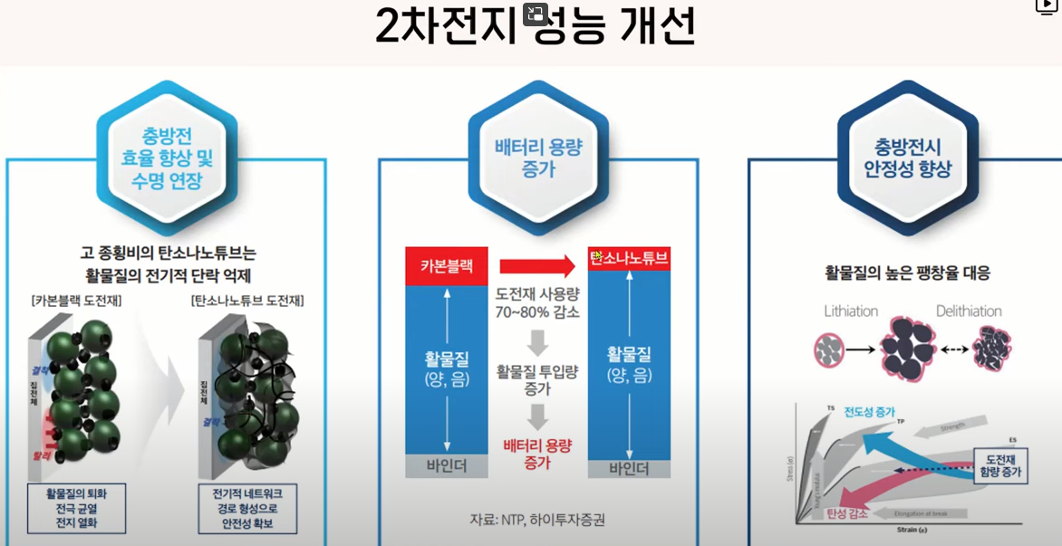 현재의 도전제로는 카본 블랙이라는 소재가 사용되고 있다고 하는데요 탄소나노튜브를 사용하면 2차전지 성능이 개선된다고 하는데 먼저 충전할 때 효율이 향상되고 안정성이 높아진다고 하고요 배터리 용량이 증가되기 때문에 한번 충전으로 더 많은 거리를 이동할 수 있게 됩니다.