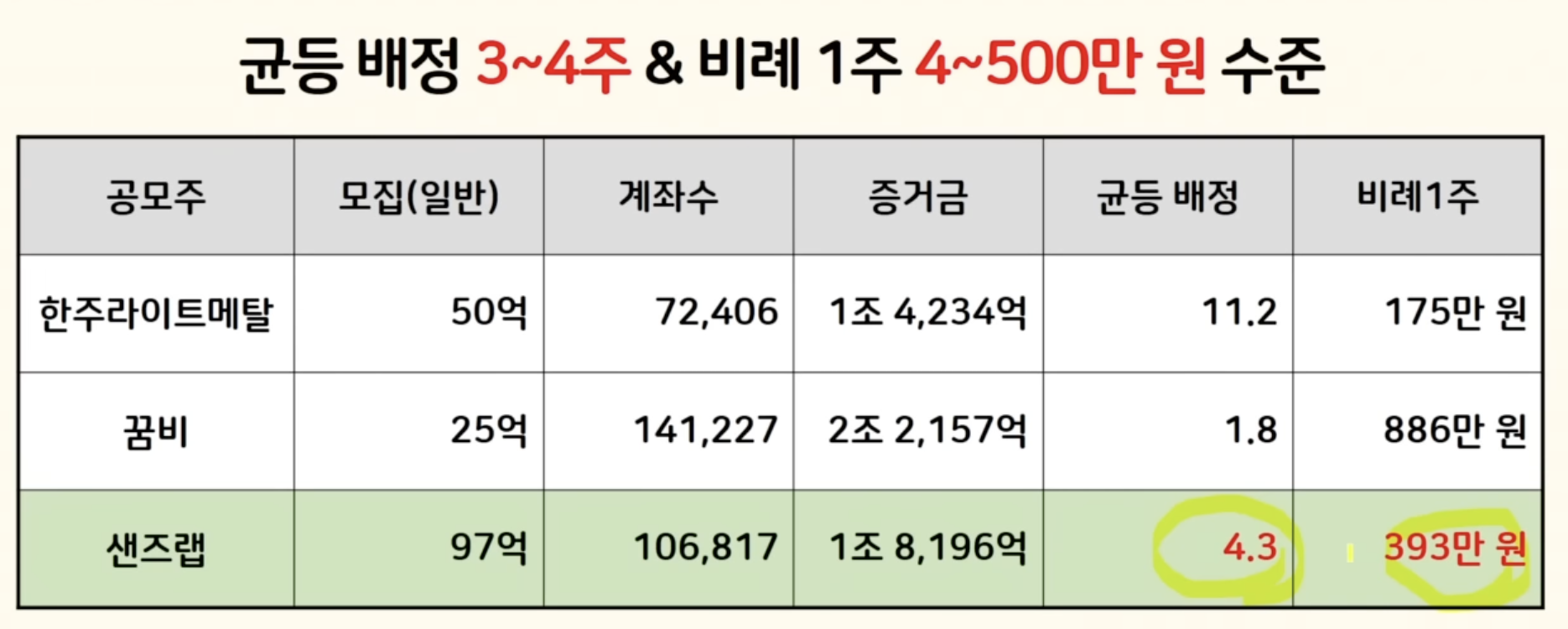그러면 균등은 4.3주 비례 한 주 증거금 393만원이 나옵니다 그런데 공모주 열기가 이렇게 뜨거워진 만큼 청약 참여가 더 증가할 수 있거든요 그래서 꿈비 공모주 때 정도까지 들어온다고 보면 균등은 대략 3주에서 4주 비례 한 주 증거금 400에서 500만 원까지 조금 넉넉하게 볼 필요가 있습니다.