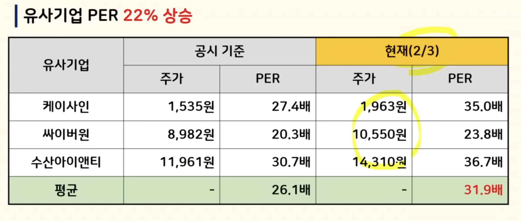 이렇게 수요예측 결과가 잘 나왔는데 유사기업과 비교해서 가격 상승 여지가 얼마나 있을지 볼게요 유사기업은 보안 및 인증 이런 기업들 3곳을 선정했고 유사성이 높아 보이죠 평균 per은 26.1배가 나왔습니다 세 곳에 per를 비교했을 때 갭 차이가 커 보이지는 않는데 최대주주인 케이사인이 여기 들어가 있네요