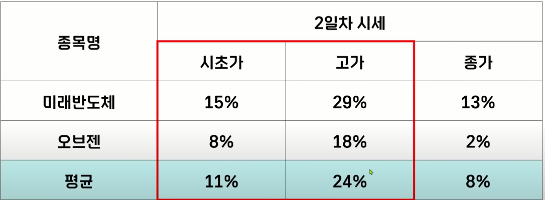 그래서 일단 더블로 시작한다면 다음 관건은 앞서 말씀을 드렸지만 따상에 안착할 수 있을까 이걸 판단을 해 봐야 되는데요 따상을 갔던 미래반도체와 오브젠은 상장 2일 차 시세를 보면 두 종목을 평균에서 보면 시초가는 약 10% 정도 떠서 시작을 했고 고가는 24%까지 올라갔습니다.