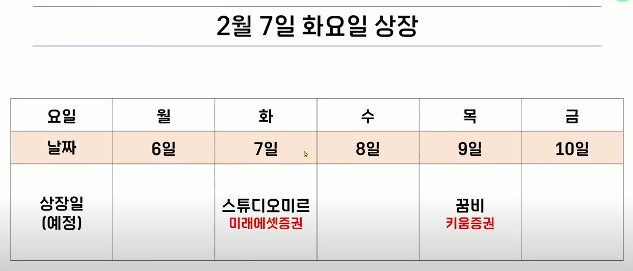 스튜디오미르는 2월 7일 화요일에 상장을 합니다. 주관사는 미래에셋증권이었고요 단독 상장합니다. 그리고 이틀 뒤에는 꿈비가 상장을 하게 되니 다음 주에 상장하는 종목은 두 종목입니다.