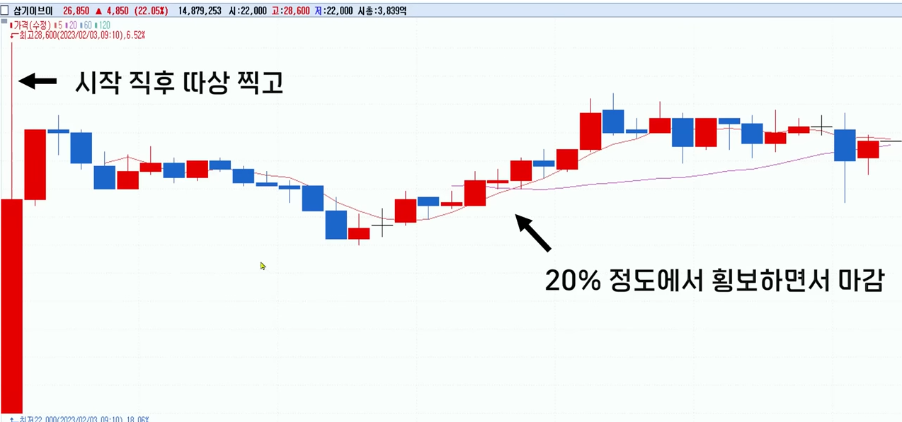 아마도 단타하는 분들이 눈치 보다가 그때 즈음에 매수 주문을 대량으로 내는 것 아닌가 생각을 하고 있고요 삼기이브이도 마찬가지 패턴이 나왔습니다. 그리고 시작과 동시에 바로 따상까지 밀어 올렸는데요 작년 상반기에 벌어졌던 누가 누가 손가락이 더 빠르나 지금 그 대결이 다시 나오고 있습니다.