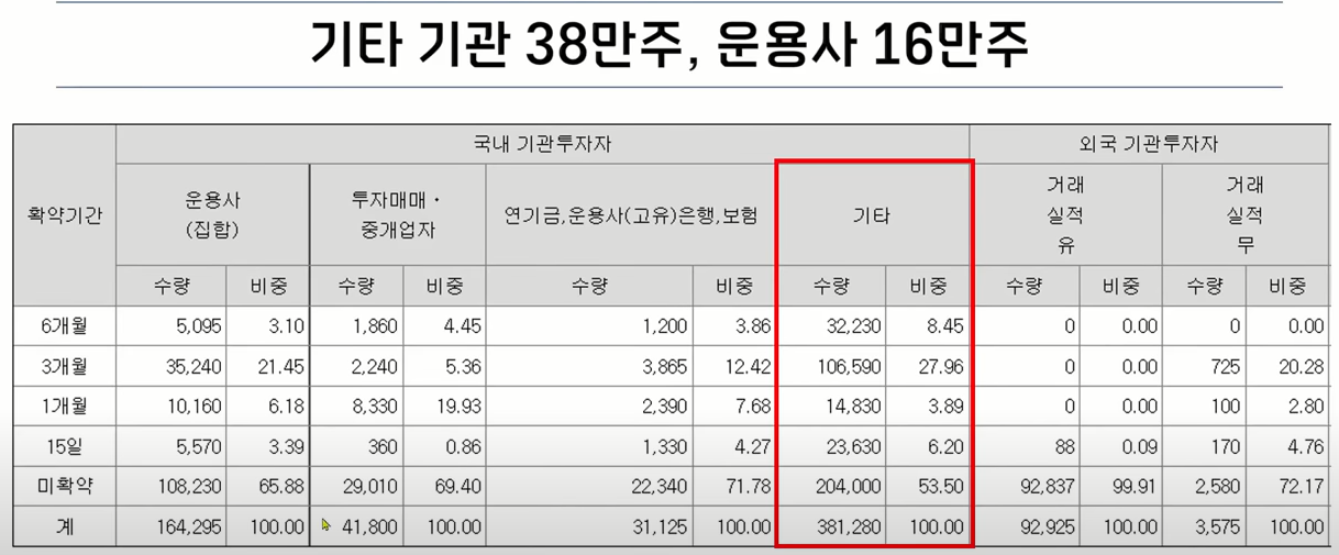 기관투자자 배정 물량은 비교적 골고루 받아 갔는데요 기타 기관이 38만주 받아가면서 전체 물량의 절반을 가져갔고요 운용사는 16만 주 그리고 외국인이 95,000주 정도 받아갔습니다.