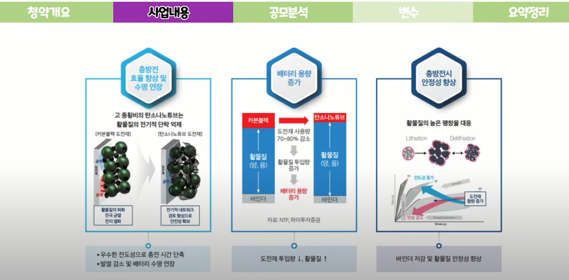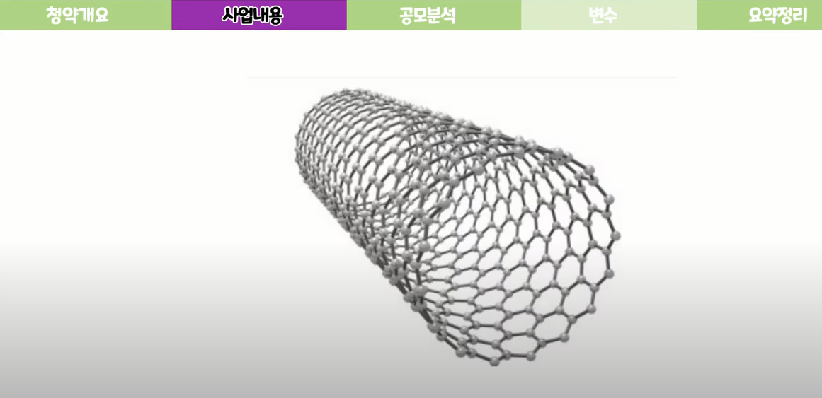 주력사업은 플랜트엔지니어링을 꼽고 있지만 새로운 성장 동력원으로 탄소나노튜브가 되실 원하고 있습니다. 탄소나노튜브는 최근 2차 전지 수요에 힘입어 다양한 산업에서 활용일 될 것으로 예상아 되고 있습니다.