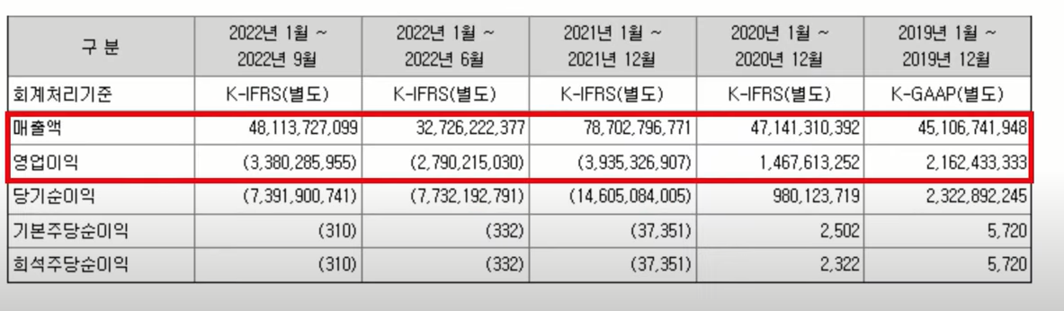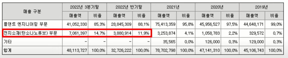다음 매출을 보시면 적자를 기록하고 있는 모습입니다. 각 사업의 매출을 보시면 플랜트 엔지니어링의 진심을 다한 기업이었는데 2022년부터 탄소나노튜브 부분에 14.7% 정도로 매출을 올리고 있습니다.