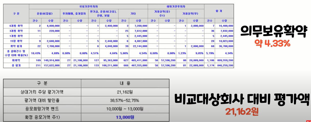 이 부분이 좀 아쉬운데요 기간 경쟁률은 낮게 나왔다 치더라도 그럼 공모가를 밴드 하단으로 했으면 더 괜찮지 않았을까 생각합니다. 보시면 밴드 하단 만원도 거의 20%가 넘어서 애매하다고 생각합니다.