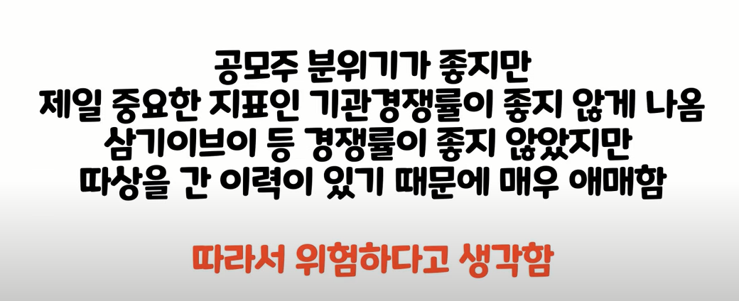 이제 변수입니다 공모주 분위기 좋지만 제일 중요한 지표인 기관 경쟁률이 좋지 않게 나왔습니다. 삼기이브이등 경쟁률이 좋지 않았지만 따상을 간 이력이 있기 때문에 매우 애매하네요..
