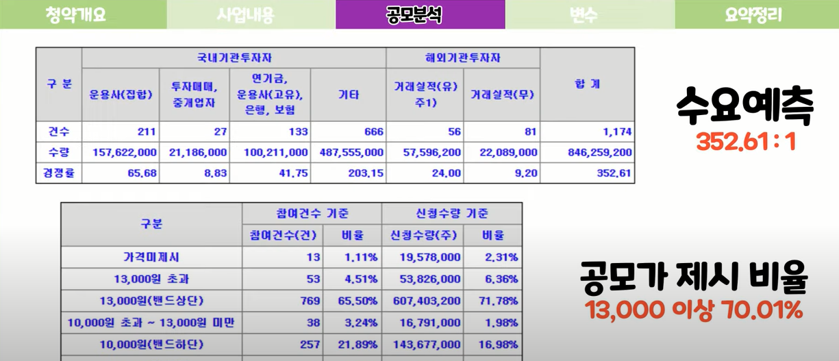 공모분석 바로 들어가겠습니다. 다음은 공모 분석입니다 먼저 기간 경쟁률부터 확인해 보겠습니다 기간 경쟁률은 325.6 길드 1이 나왔습니다. 다음은 기관들의 공모가 제시 비율입니다 공모가제시비율은 공모가 상단인 13,000원 이상이 70.01%가 나왔습니다.