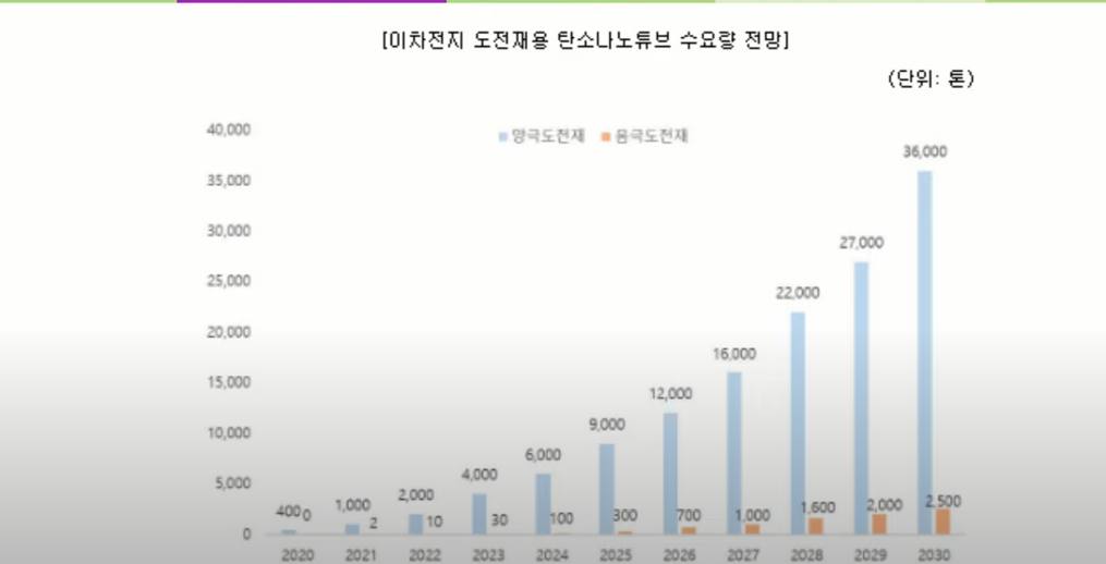 다음은 탄소나노튜브가 전지제조사로 들어가기까지의 흐름입니다 단지 제조사를 보면 저희가 잘 아는 sk1과 catl 등이 있네요 그리고 탄소나 유튜브 수요량 전망은 엄청난데요 2030년은 지금으로부터 9배 수요가 있을 거라고 전망합니다.