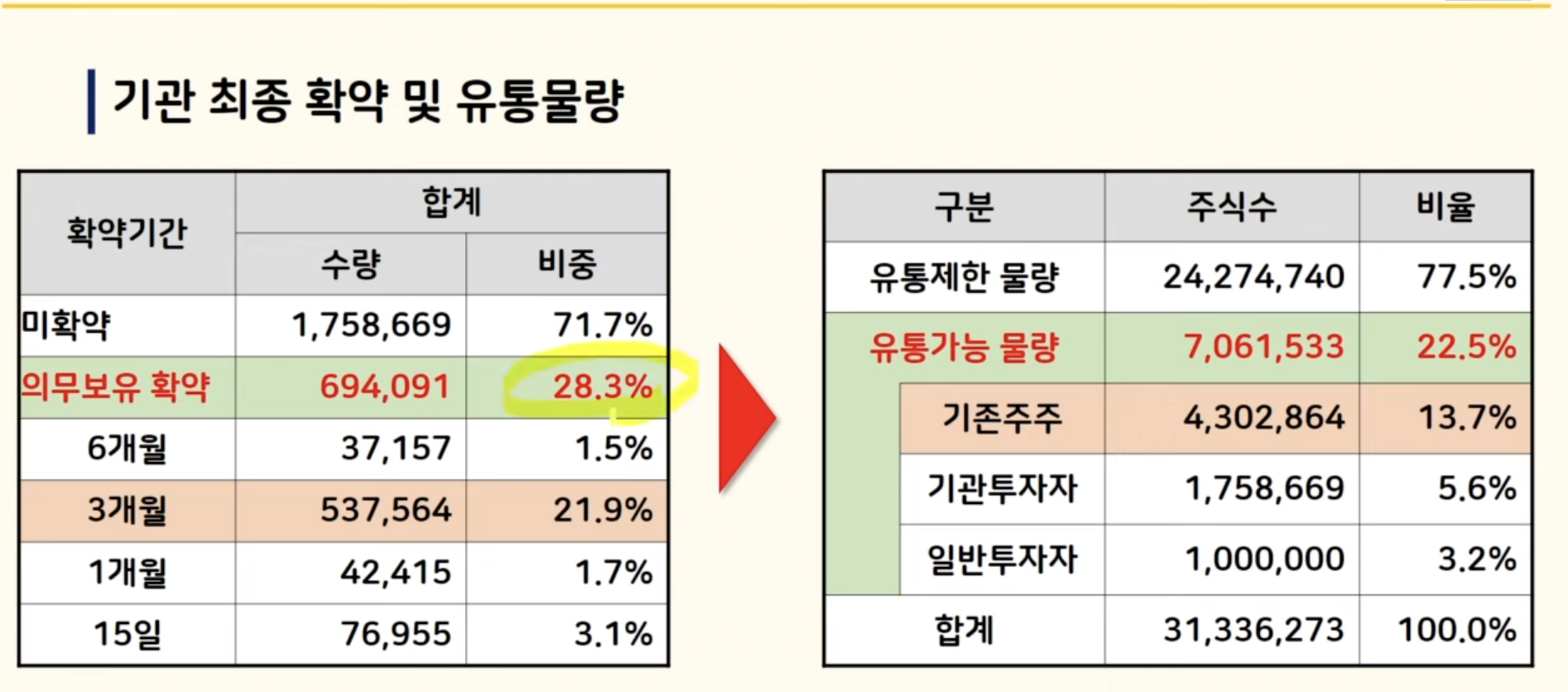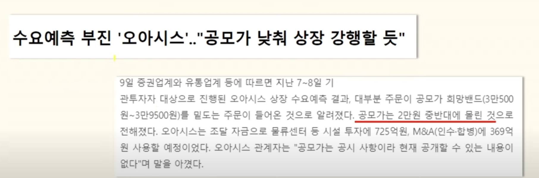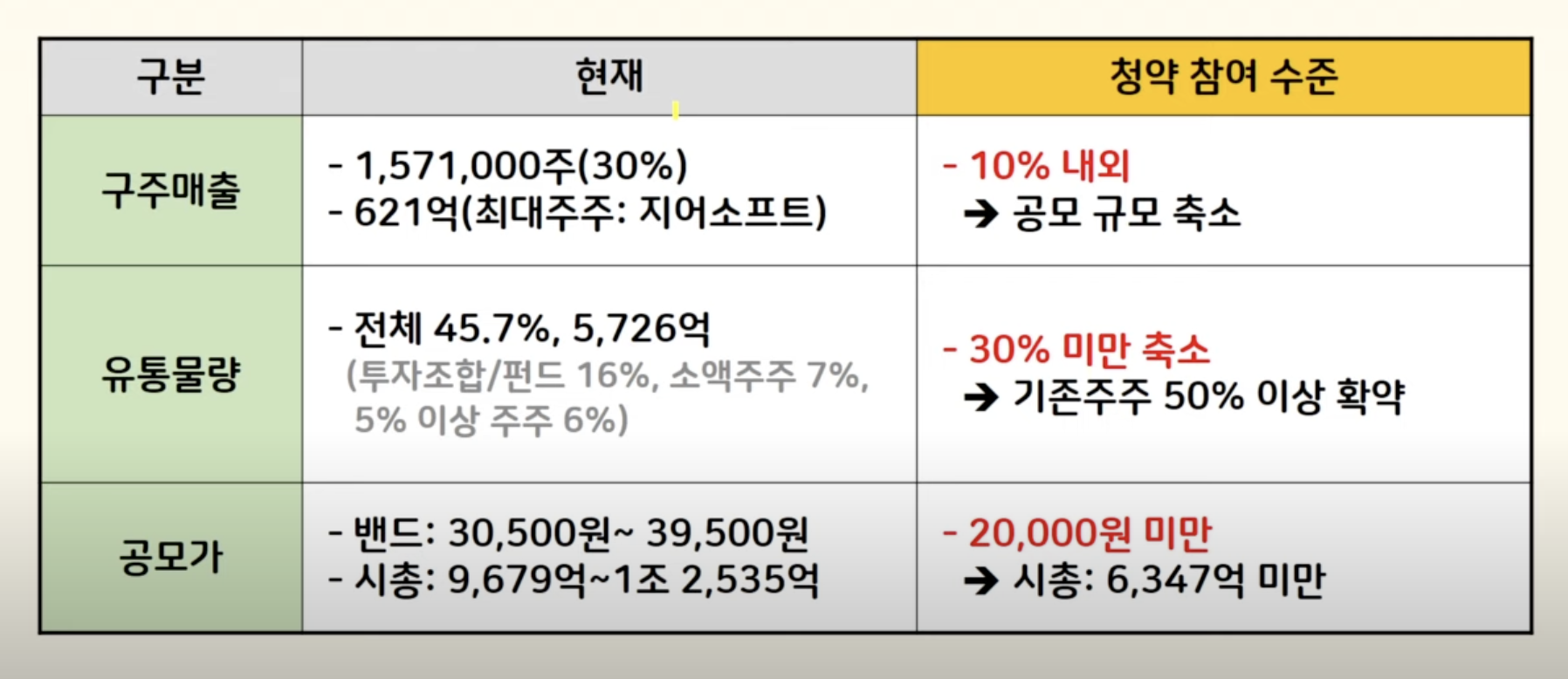 그래서 기존 45%에서 30% 미만으로 축소가 필요하고 그럼 기준주주 지분 절반은 확약으로 돌려야 됩니다. 마지막 공모가는 2만원2만 원 중반 비중이 높다고 했는데 규모가 워낙 큰 공모주다 보니까 저는 2만 원 그때까지는 떨어져야 고려를 할 수 있을 것 같습니다.