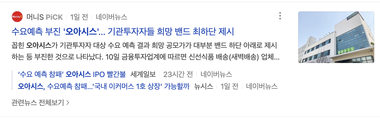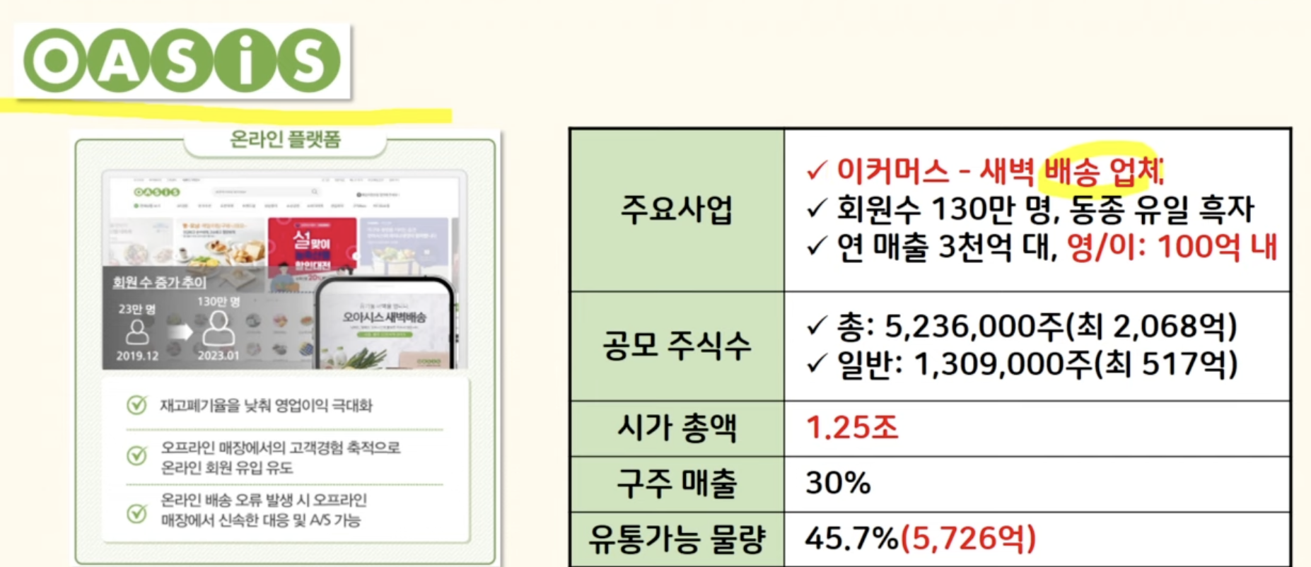 이제 공모주청약 바로 보도록 하겠습니다. 다 아시는 것처럼 이번주는 오아시스 공모주와 청약합니다 새벽 배송 업체고요 규모가 큰 이커머스 업체 중에 유일하게 흑자를 내고 있다는 게 오아시스의 유일한 장점이죠 공보주식수는 총 520만 주가 넘고요 일반 청약자에게 그중 25% 배정합니다.