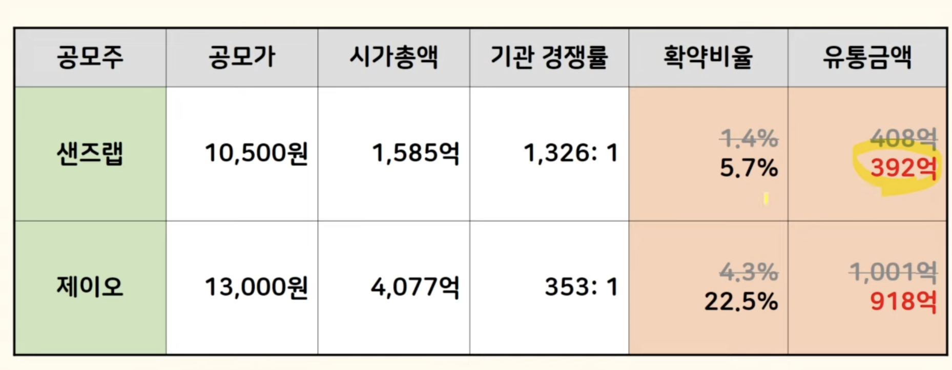 기존 주주의 매도 타이밍 이게 상장의 관건이 될 것 같아요 그래서 최종 유통 금액은 샌즈랩이 392억으로 뭐 큰 변화는 없을 것 같고요 제이오는 100억 정도 줄어서 918억이 됐습니다. 특히 제이오 확약이 대단했는데요 우리 사주 조합이 일부 미달되긴 했지만 그래도 유통 금액은 많이 줄였네요 게다가 최근 공모주들 결과를 보면 따상은 기본이고 상장 다음날에도 엄청 올랐어요.