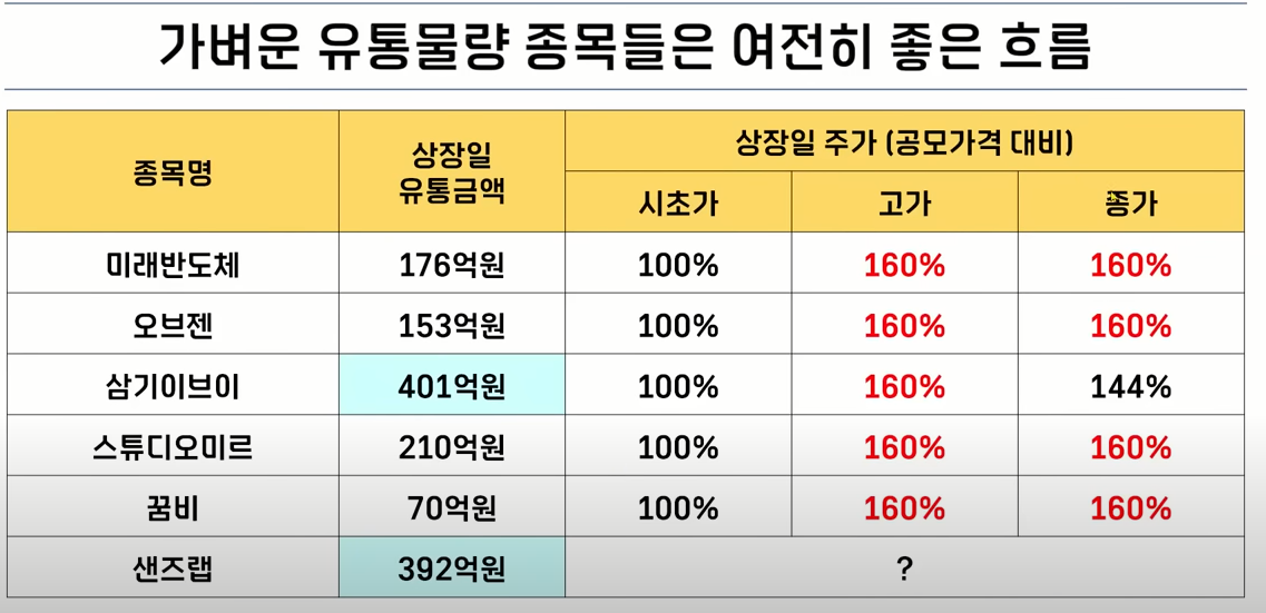매도하고 싶었던 그 순간을 꾹 참고 버텨내었으니까요 이번 주에는 더욱 높은 가격에서 보내실 수 있을 겁니다 자 그래서 지금 상장일 유통 금액이 가벼운 종목들은 상장이래 따상이 나오고 있고요 꿈비처럼 정말 가벼운 종목들은 따상상까지 나오고 있습니다.