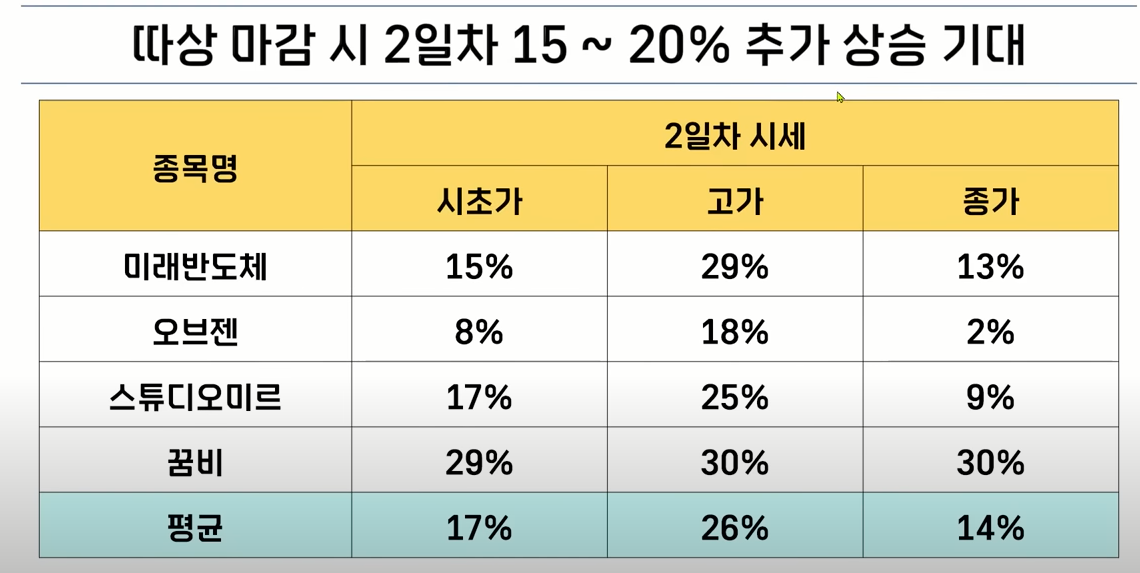 그리고 이렇게 따상으로 마감할 때까지 팔지 않았다면 그 인내심에 대한 보상을 다음날 받아야겠죠? 따상갔던 4 종목 2일 차를 평균해 보면 시초가를 17%에 띄워서 시작을 했고요 고가는 26%까지 올라갑니다. 그리고 종가는 14%로 마감을 했는데요 그래서 첫날 따상에서 매도를 하지 않고 버텼다면 다음날에는 15에서 20% 정도는 추가 상승을 기대할 수 있다 이렇게 보고 있습니다.