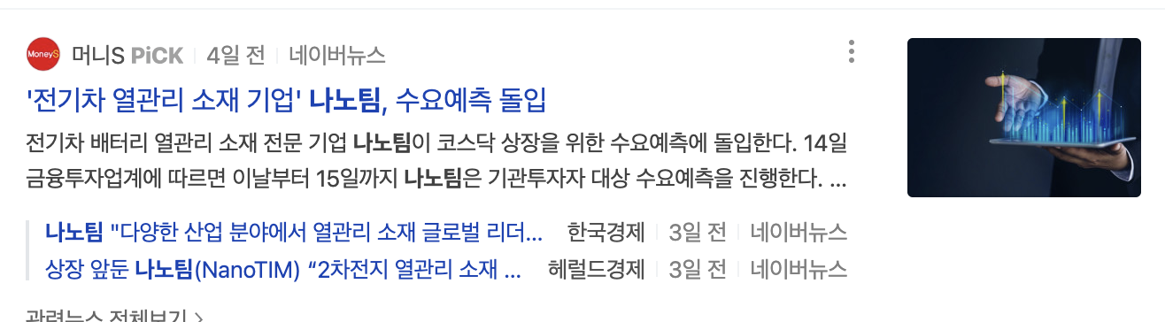 그동안 공모주들의 성적이 너무 좋았습니다. 다음 주 청약공모주 나노팀 수요예측 결과를 보면서 이번에도 또 따상 대열에 올라탈지 알아보도록 하겠습니다. 나노팀은 앞으로 가장 성장가능성이 큰 누구나 그렇게 생각하시는 전기차 관련 기업입니다. 뭐 요즘 상황에 전기차 관련 기업이면 묻지도 않고 상승을 예상해 볼 수가 있는데요.. 그중에서도 2차 전지와 관련이 있는 기업인 나노팀입니다.