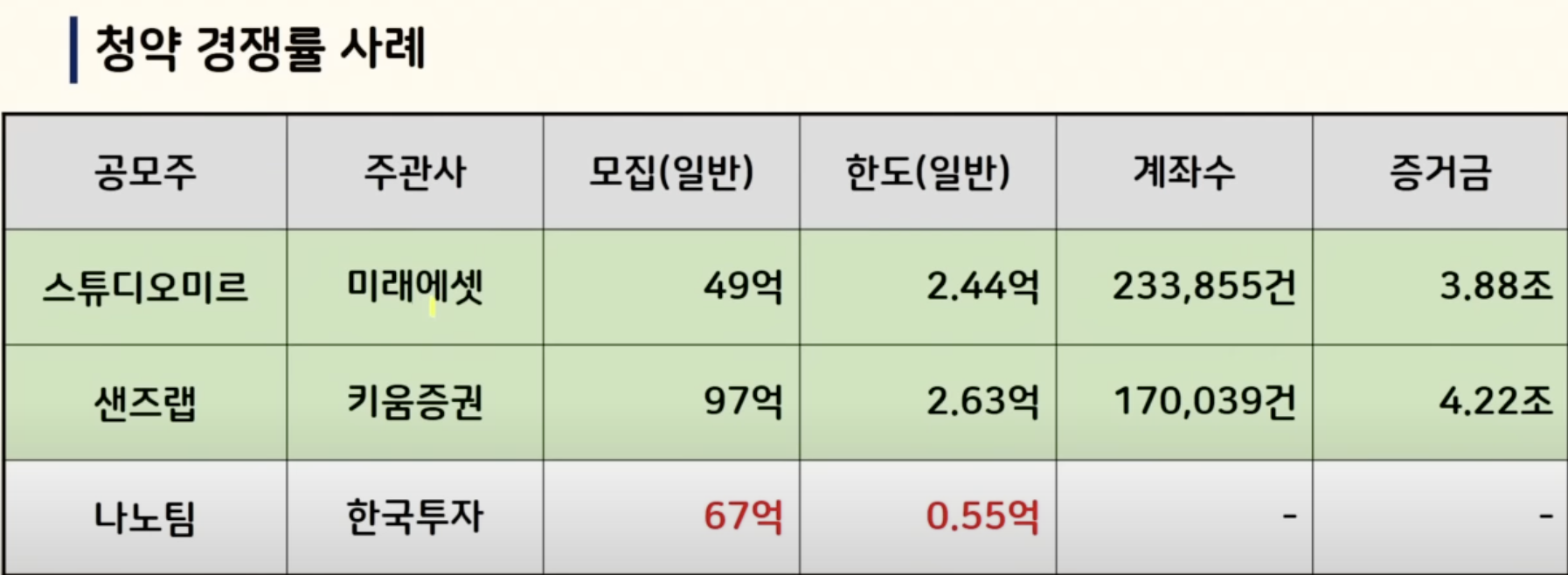 먼저 최근 증거금이 많았던 두 곳 스튜디오미르와 샌즈랩 특히 샌즈랩 수요예측 결과가 그리 좋지 못했는데도 엄청 많은 자금이 몰렸습니다. 그런데 이들의 청약 한도를 보면 일반고객 기준 모두 2억이 넘었고요 반면에 나노 팀은 온라인 청약자 5,500만 원 밖에 되지 않습니다.