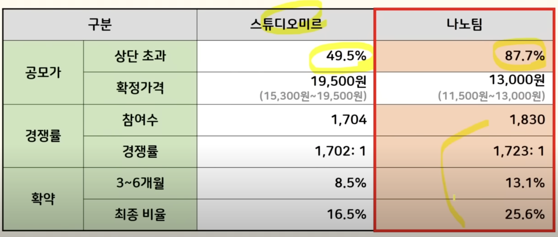 그 외 경쟁률이나 확약 모두 나노팀이 우세하기 때문에 스튜디오미르 버금가는 수익률 기대가 됩니다. 최근 종가 따상간 공모주들과 비교해 보면 특히 확약에서 차이가 크게 납니다.
