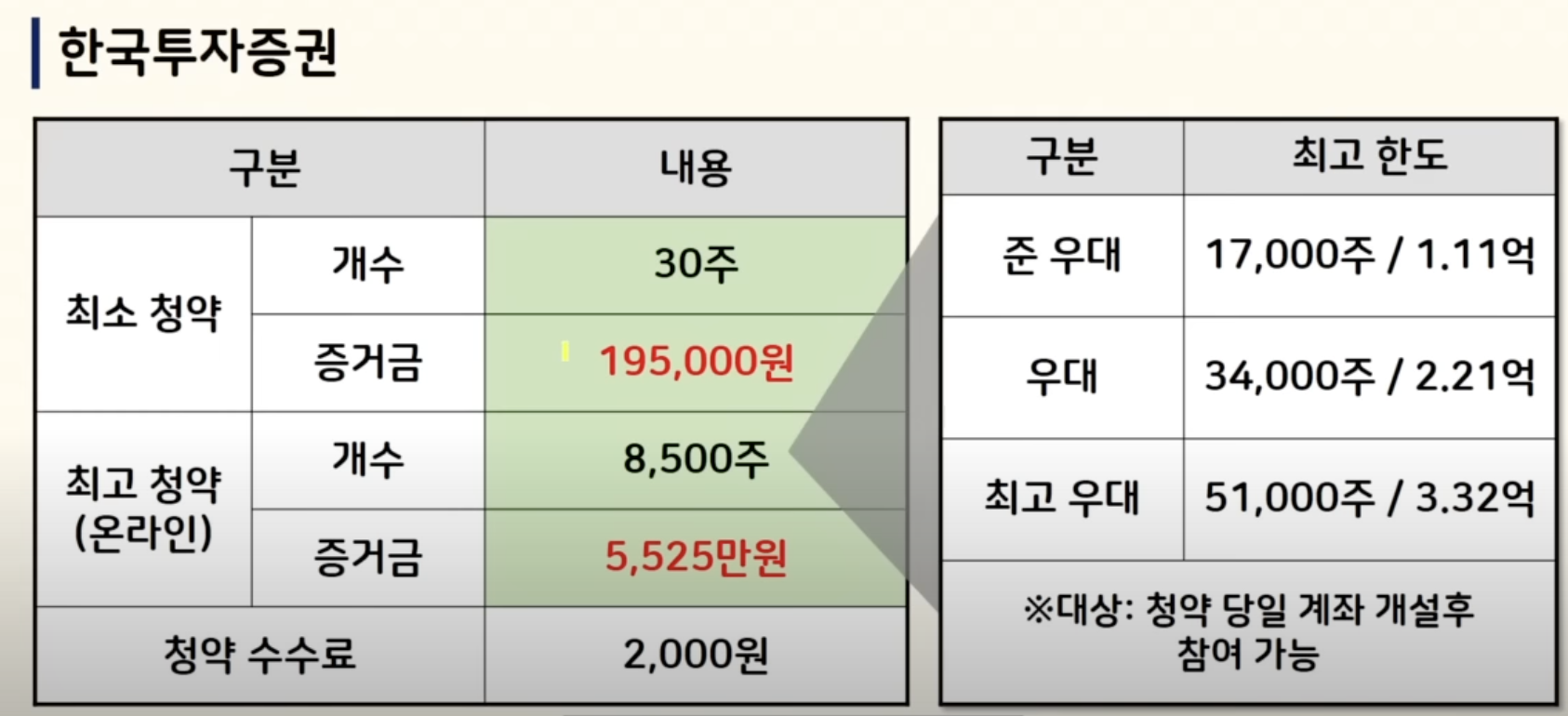 주관사가 한국투자증권이고 최소 청약수는 30주 195,000원 필요합니다 앞서 말씀드린 것처럼 온라인 최고 청약 한도 8,500주 5,500만 원 정도밖에 안 돼요 그 왜 우대가 되는 분들은 더 많은 자금 활용할 수 있으니까 참고해 주시고요 수수료 2,000원 있습니다 따상 가능성이 큰 공모주 나노팀 모두들 좋은 수익 거두시기 바랍니다.