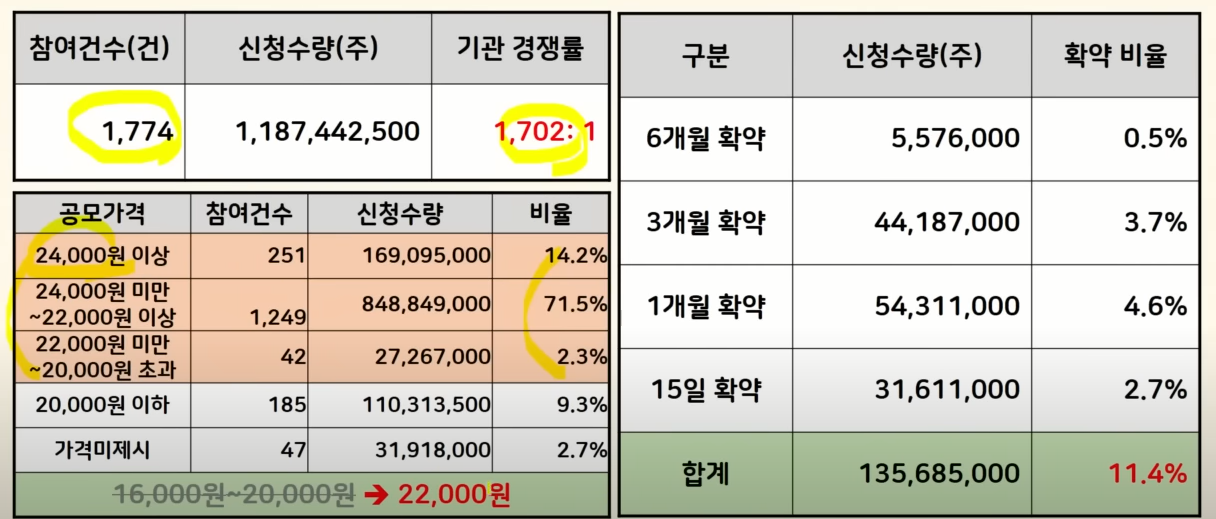 좀 아쉬울 수는 있지만 따상이 된다 가정에 보면 그만큼 수익이 늘어나니까 또 좋을 수 있어요 그리고 확약은 11.4% 그래도 10%도 넘겼습니다. 훌륭합니다.