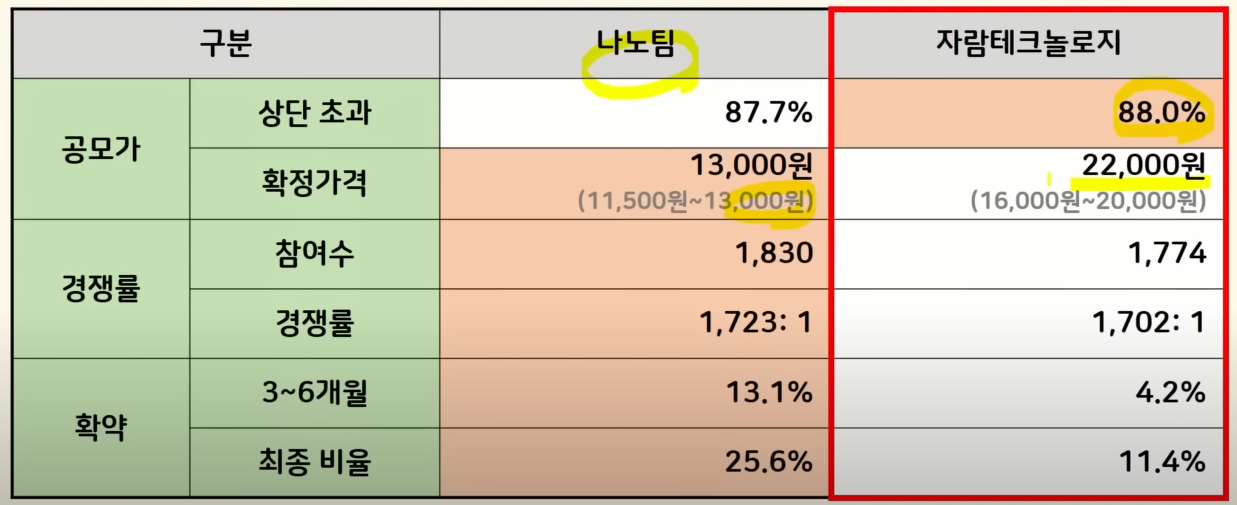 최근에 수요예측 결과가 가장 좋았던 나노팀과 비교해보면 상단 초과 비중이 거의 비슷하지만 그래도 자람테크놀로지가 더 높아요 그런데 나노 팀은 공모가를 상단으로 확정을 했는데 자람은 상단 초과를 했죠 이건 나노 팀이 더 좋다고 볼 수 있고요 경쟁률이나 확약 모두 나노 팀이 더 근소하게 앞섭니다.