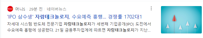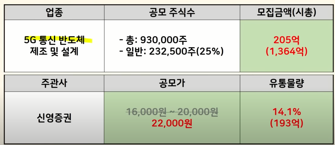 그리고 자람테크놀로지는 5G 통신 반도체를 만드는 회사였었죠 공모주식수 총 93만 주 일반 청약채 25% 배정하고요 모집 금액은 200억 시총이 1,364억으로 상장합니다. 주관사는 신영증권이고요 공모가는 밴드 상단보다 초과한 22,000원 확정됐습니다.