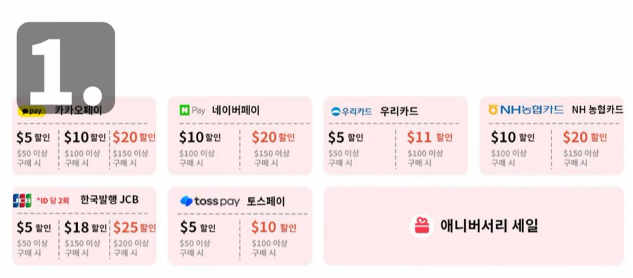 첫 번째 카드 할인은 카카오페이 네이버페이 우리카드 농협카드는 아이디랑 1회 한국에서 발행된 JCB 카드는 아이디랑 2회 할인 받을 수 있어요 이번에는 토스페이까지 추가되었으니 참고하세요