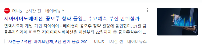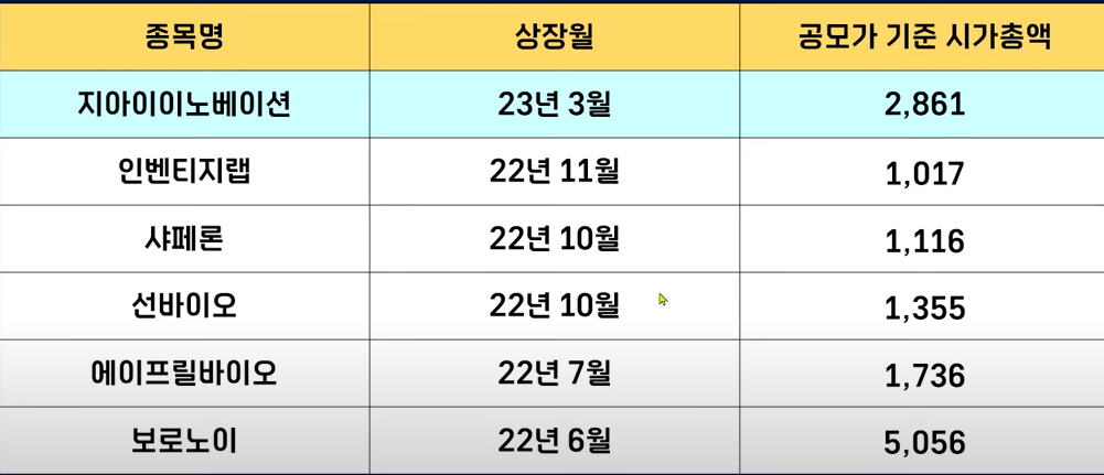 그리고이 종목은 공모 가격 기준으로 시가총액이 2861억 원인데요 최근에 신약을 개발하는 바이오 종목들과 비교를 해보면 작년 6월에 상장했던 보로노이보다는 그래도 사이즈가 적지만 그 이후에 등장을 했던 에이프릴 바이오, 선바이오 샤페론 ,인벤디지랩 이론 종목들은 모두 1000억 원대로 등장을 했거든요 그런데 지아이이노베이션은 시가총액의 이론 종목들보다 2배 이상 큽니다. 그래서 아무래도 상장일에 가볍게 움직일 만한 조건이 아니기 때문에 이렇게 사이즈가 크다는 점은 저는 단점이라고 보고 있습니다.