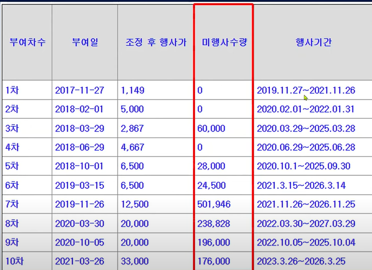 그리고 행사기간이 도래한 스톡옵션이 약 100만 주나 있는데요 그런데 스톡옵션을 자세하게 보니까 행사 단가가 공모 가격보다 높은 경우도 있었고 또한 임원들이 보유한 수도 옵션은 의무확약이 걸립니다.