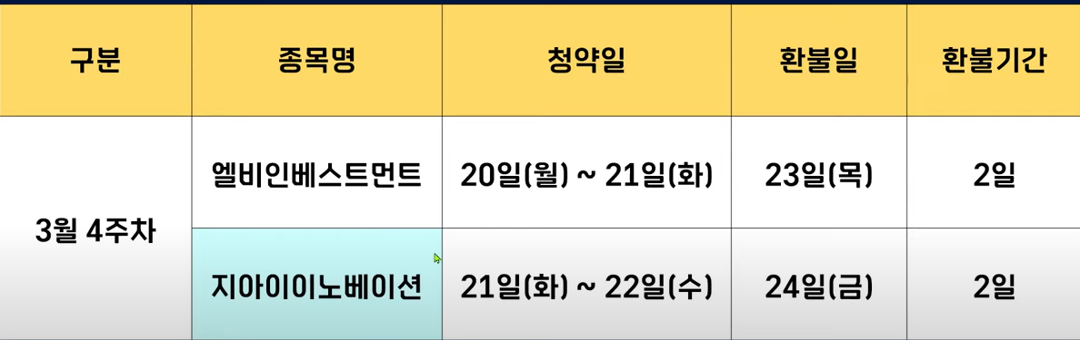 지아이이노베이션은 내일과 모래 청약을 합니다 그래서 오늘부터 청약을 시작한 lb 인베스트먼트와는 청약 일정이 겹치게 되었고요 환불일은 24일 금요일이기 때문에 환불 기간은 이틀입니다. 그리고 상장일은 3월 30일 목요일로 예정이 되어 있는데요 아마도 그날 단독으로 상장할 것 같습니다.