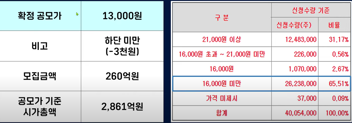 그리고 수요 예측이 저조하다 보니까 공모 가격 내려가야 되겠죠 13,000원으로 확정이 되었는데요 하단 공모 가격이 16,000원이었는데 3천 원 낮아졌습니다. 공모가격 신청결과를 보니까 65.5%는 공모가를 하단 미만으로 신청을 했는데요 아마도 대부분이 13,000원 정도 신청을 했던 결과가 아닐까 싶습니다.